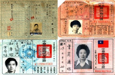 身分證歷經第一代到第六代的演變,可以看到手抄本的身分證、男女有別的男性墨綠色身分證與女性粉紅色身分證。民國36年的身分證,則是手抄本與印刷的綜合體。