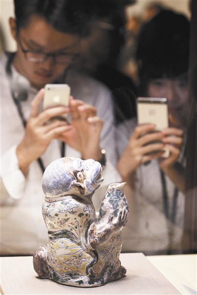 國立故宮博物院昨天起至十二月一日,試辦有條件開放攝影,圖為民眾正在拍攝〈越南青花加彩猴王〉。圖/林伯東