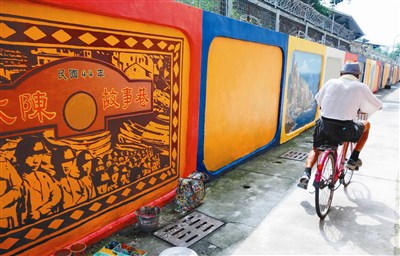 【本報高雄訊】在高雄旗津,有一面長一萬三千五百一十八公分的「大陳彩繪巷」,猶如長長卷軸的牆上,畫著大陳居民六十年前撤退來台後,他們在旗津當碼頭工人、做年糕、曬魚乾等生活,一甲子時光的大陳記憶,就此喚醒。