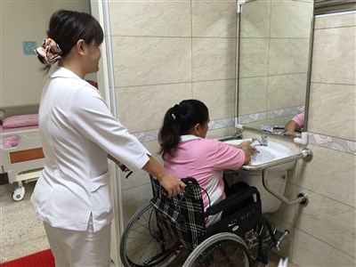 衛浴也是老人易發生意外的地點,陳興剛說,老人病房的衛浴空間也特別加大,且設計無障礙,讓需要輪椅的老人家使用,例如房間到衛浴無門檻設計,洗手台降低,坐著輪椅可以直接洗手,廁所馬桶、洗澡等處,都加設扶手,讓患者仍能維持獨立的活動,也提供更好的照護服務。