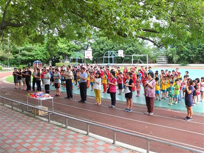 「立正、敬禮」全校師生對於200年楓香爺爺的祈福與敬禮,王恭志說,除了養成學生尊天敬地、愛護大自然環境的精神,也藉此感謝三棵200歲的楓香爺爺長年以來呵護文山國小全體師生,看著學生一步步成長,也期望新學期學生有更多傑出表現。