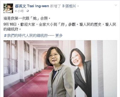 【本報台北訊】總統府新的常設展「府」將在18日對外開放,總統蔡英文今天先睹為快,蔡總統和自己的人型看板合照,並將照片上傳臉書,幽默表示:「這是我第一次和『她』合照」。