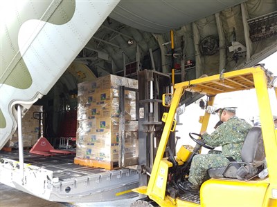 莫蘭蒂颱風重創金門,國防部上午前運1600箱礦泉水和6000包泡麵等物資來援。圖/國防部提供