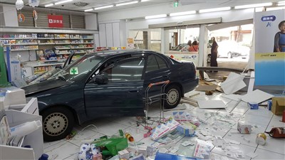 警方說,這家藥局為體貼客戶停車,特別把店面退縮,留下空間讓客入停車,但謝姓婦人駕駛轎車要爬上人行道進入店面停車時,因未對準上爬的位置,油門一時加的過大,結果就衝進了店裡;地上留有清晰的輪胎痕,被撞的機車車尾損壞,車牌和安全帽都掉落在地上。