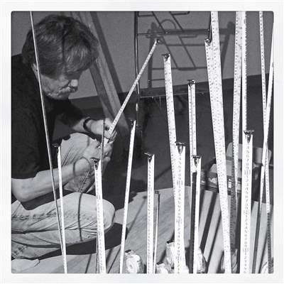 「未來請柬」當代藝術展展出多位藝術家的限地製作(Site Specific) ,圖為藝術家莊普以工匠常用的魯班尺創作〈巨蛋外的噴泉〉。圖/中央社
