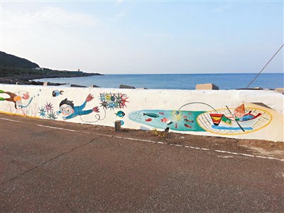 【本報基隆訊】長長的貢寮卯澳漁村海堤上,近來多了許多活潑可愛的彩繪,熱鬧的海洋市集、捕撈漁獲的漁民、騎腳踏車和浮潛的遊客們全躍上牆。