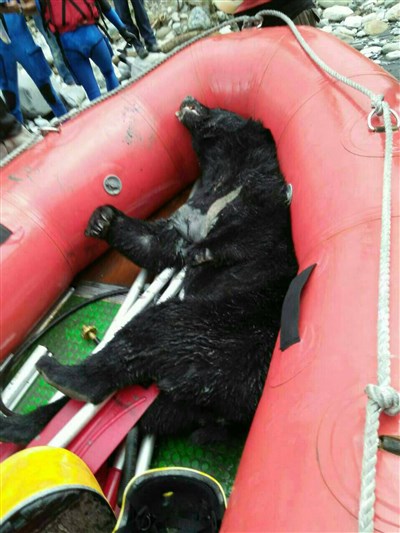 花蓮南安部落布農族人2天前在南安遊客中心上游約200公尺處溪床發現躺臥在河床的黑熊,當時因溪水暴漲,無法過去查看,今天消防人員前往救援,黑熊已死亡,消防人員和民眾合力將黑熊以橡皮艇送上岸。