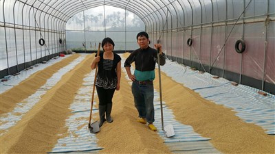 南投縣湯英華(右)、曾盈婷(左)夫妻,以友善農法耕作、用陽光曬稻穀,米粒品質飽滿香甜,並自創「鹿谷鄉瑞田日光米」品牌,走出不一樣的路。圖/蕭博陽傳