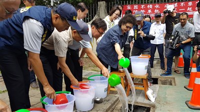 陳菊同時示範以無磷洗衣粉泡水倒於積水場域和水溝,盼民眾配合防範登革熱孳生源。
