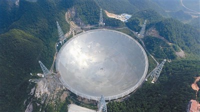 大陸自製的「超級天眼」(FAST),射電望遠鏡,口徑達五百公尺,理論上能接收到一百三十七億光年以外的電磁訊號,這個距離接近於宇宙的邊緣。大陸科學家比喻說,「有人在月亮上打手機,也逃不過它的追蹤」。