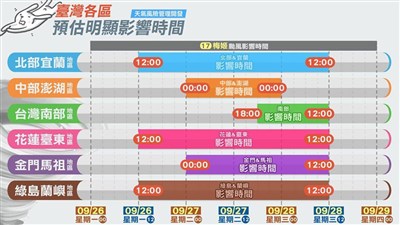 【本報綜合報導】天氣風險公司總經理彭啟明今天在臉書上,分享中颱梅姬預測路徑及預估明顯影響的時間。根據「WeatherRisk 天氣風險」臉書提供訊息,各地影響時段如下:
