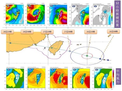 中央氣象局官方臉書粉絲頁「報天氣」上,公布累積雨量和平均風力圖,是根據中央氣象局最新的官方路徑預報及系集數值天氣預報(Weather Research and Forecasting Model,WRF)所產出,依據颱風行進的時間序列,所對應出不同時段的預估累積雨量及平均風力。