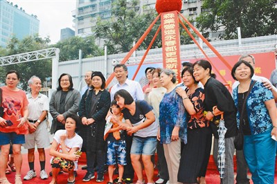 永春都更案延宕十六年,昨天終於舉行開工典禮,台北市長柯文哲與出席的同意戶在典禮後開心合照。圖/徐葳倫