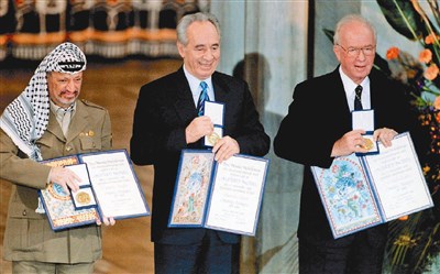 1994年 因斡旋以巴和平進程,與時任以色列總理拉賓和巴勒斯坦領袖阿拉法特共同獲得諾貝爾和平獎。阿拉法特已於2004年11月辭世。