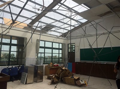 洪瑞濱指出,梅姬颱風的強勁風勢,3樓3間專科教室,瞬間整個屋頂被風掀開吹落,波及到另一側屋頂、走廊欄杆、教室玻璃等,教室內設施及實驗器材因浸水損壞。
