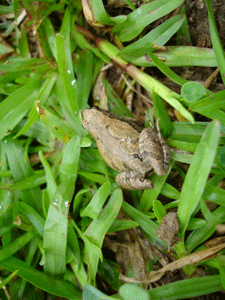 春天在關渡自然公園內唱求偶歌的有幾種蛙類,牠們是黑眶蟾蜍、小雨蛙、澤蛙、虎皮蛙,以及貢德式赤蛙。這次我們先介紹黑眶蟾蜍與小雨蛙。
