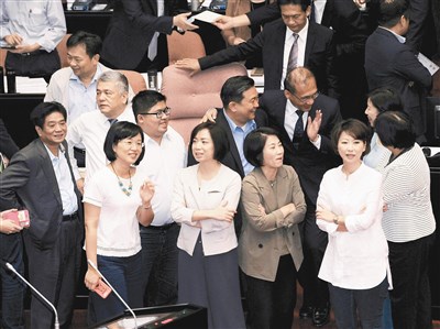 民進黨立委昨由總召柯建銘帶隊,一早就進入立法院議場,守護著主席台,中間休息時,更將通道堵住,希望維持開會議事順利進行。圖/中央社
