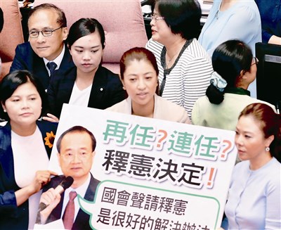 立法院院會昨天上午變更議程處理司法院人事案議程草案,國民黨團針對大法官被提名人許宗力,舉海報提出強烈抗議,原本到院準備備詢的行政院長林全(左上),笑著靜觀其變。圖/屠惠剛