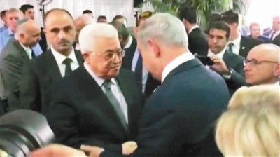 阿巴斯相隔六年後再訪以色列,報導指在裴瑞斯家人要求下,阿巴斯被安排坐在第一排。葬禮上出現極罕有的畫面,阿巴斯(見下圖前排左/路透)抵達時,與以色列總理納坦雅胡握手和短暫交談。