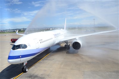 【本報台北訊】中華航空股份有限公司首架A350-900XWB客機今天中午12時降落台灣桃園國際機場。華航董事長何煖軒與空中巴士執行副總裁艾夫拉(Didier Evrard)昨天中午12時共同在法國吐魯斯舉辦交機典禮。