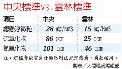 為改善空汙,雲林縣政府針對電力設施自訂加嚴標準的「雲林縣電力設施空氣汙染物排放標準」,已獲環保署核定,為全國最嚴格的傳統空氣汙染物排放標準。縣府表示,新標準預定十天內完成公告,公告後半年實施。