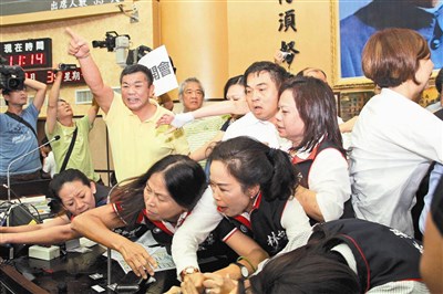 台南市議會昨天召開臨時會選舉議長,國、民黨議員在主席台上拉扯,爆發嚴重衝突,雙方多人掛彩。圖/中央社