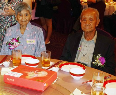 高雄市政府6日舉辦「2016璀璨摯愛─銀髮婚頌禮讚」,邀請120對平均年齡78歲的銀髮佳偶參加,其中婚齡72年的鍾明進(右)和鍾張龍妹(左)被問及相處之道,阿公說,就是互相忍讓。圖/中央社