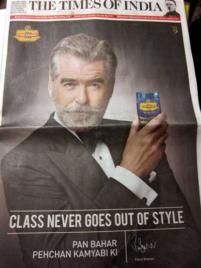 印度英語和地方語言報章,7日普遍刊登整版廣告,廣告中皮爾斯布洛斯南留著一臉帥氣的大鬍子,擺出007的標準姿勢,但手上拿的不是槍,而是一小罐印度人用來飯後清爽口氣的綜合香料種子(pan masala),廣告標語寫著:「永不走味的格調」。