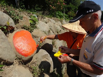 從8月開始,社區居民與關心的民眾一同將小南坑野溪親水步道旁的石駁坎上的石頭,以油漆方式彩繪出蝴蝶「卵」型態的顏色與樣式,代表蝴蝶成蟲於此產下即將孵育新生命的卵。
