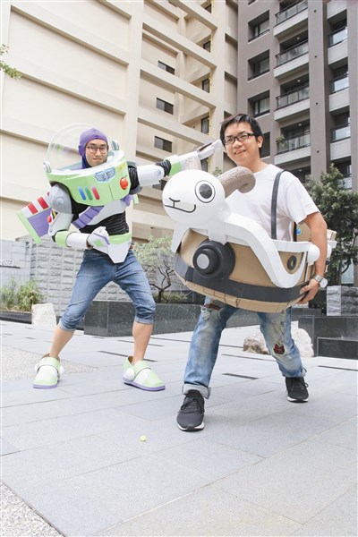 劉能堯(左)六年來參加超過二十場馬拉松賽事,透過「DIY裝扮」增添賽事趣味,他今天將穿「巴斯光年」參加國慶路跑。圖/葉建宏