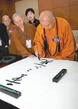 星雲大師在開幕典禮中表示,期望藉著書法藝術,讓人間佛教滋潤澆灌重慶市民,讓兩岸永久和平,充滿法喜,讓全球華人心生慈悲。