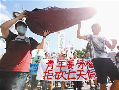 【本報台北訊】反對週休二日修法草案,青年團體昨天發動「青年爭勞權,圍攻資進黨」遊行,從立法院大門口走到民進黨中央黨部「爆肝」,抗議政府刪除七天國定假日。