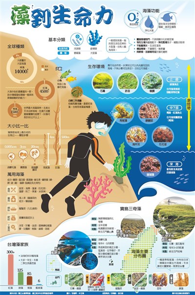 台灣四面環海,夏天一到,常有人受不了烈陽炙烤,愛跳入大海享受清涼;這時除了觀察悠遊身邊的水中生物外,不妨也來認識一下潮間帶常見色彩、型態各異的海藻吧!海洋植物是地球上最古老的生物之一,供給海洋生物食物及氧氣的來源;藻類正是海洋植物中數量最多、種類最豐富的一群;比起陸地植物對人類的貢獻,海藻有過之無不及,也可說是生物科技明日之星。不說別的,或許你家餐桌上,今天正擺著一盤呢!