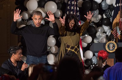 美國總統歐巴馬10月31日以麥可傑克森的「顫慄」搞笑版舞蹈,以及發放糖果給奇裝異服小朋友的方式,度過他在白宮的最後1個萬聖節。圖/法新社