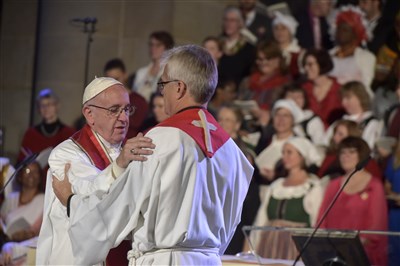 天主教教宗方濟(左)及世界路德教會聯合會主席約南十月三十一日在瑞典隆德大教堂,參加紀念宗教改革五百年活動,教宗呼籲基督徒和解。圖/美聯社