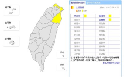 中央氣象局發布大雨特報,今天基隆北海岸及宜蘭地區有局部大雨發生的機率。圖/取自氣象局網站
