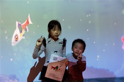 十三行博物館打造海底隧道,小朋友現場畫魚後,可將魚投射在牆面與「自己的魚」一同悠游互動。圖/連珮宇