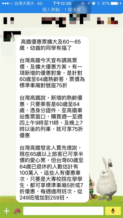 最近在LINE等通訊軟體廣泛流傳「高鐵優惠票擴及60到65歲」訊息,高鐵公司今天鄭重澄清,相關優惠現已終止,盼切勿繼續以訛傳訛,造成旅客困擾。圖/LINE群組截圖