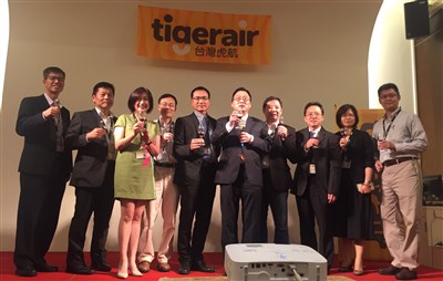 台灣虎航董事長張鴻鐘(左五)今天宣布明年1月3日停飛新加坡、亞庇航線,但也同步宣布明年3月4日開航高雄─沖繩那霸航線。圖/侯俐安