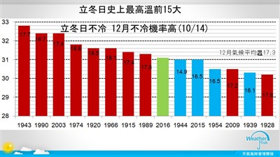 他說,統計台北立冬日過去百年以來的資料發現,最熱的立冬日最高溫是1943年的32.8℃,其次是1990年的32.4℃,今年剛好排在第9名,去年也出現31度高溫排在第11名。