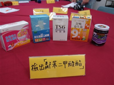 根據檢驗資料,消基會說,TS有益菌及舒暢益生菌粉末食品驗出DEHP;楊明國際公司旗下產品藍莓果粒果醬則驗出DINP;元氣堂全能消化益生菌兩項產品除了含有DEHP外,也分別驗出含有DIBP及DINP,另外還有益生菌Q軟糖塑化劑濃度為1.2ppm。