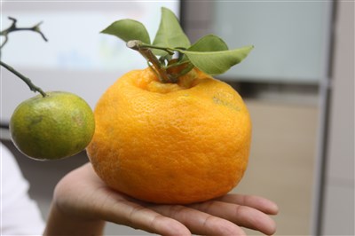 台灣休閒農業發展協會今天展示台中石岡有「一口柑」美稱的砂糖橘、佛利蒙、蜜柑、改良日本進口的「不知火」,其中尤以「天王柑」最讓人驚豔,這種柑橘比起其他品種柑橘的個頭要大上許多,香甜飽滿依舊,更有農友種出的「天王柑」比臉還大。