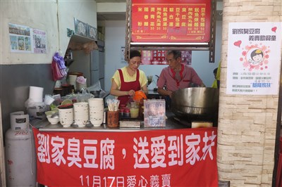 劉家臭豆腐老闆劉清山今天過74歲生日,他已10年捐出一日所得幫助家扶中心,這是他最棒的生日禮物。圖/林孟潔