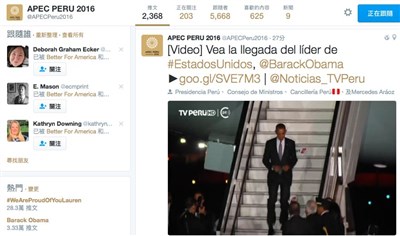 美國總統歐巴馬18日晚間抵達秘魯利馬,將於19日傍晚與中國大陸國家主席習近平進行雙邊會談。圖/取自網路