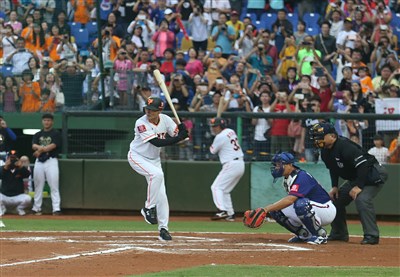 王貞治穿著巨人隊1號球衣,在7局上走進打擊區,面對台灣傳奇名投郭泰源,重現傳說中的金雞獨立打法。圖/中央社