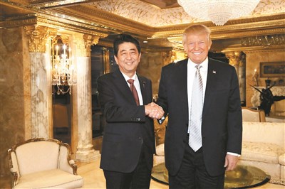 美國總統當選人川普(右)21日說,一上任就會退出跨太平洋夥伴協定(TPP)。日本首相安倍晉三(左)回應,TPP少了美國就沒意義。圖為兩人17日在紐約曼哈坦川普大樓會晤時的檔案照。圖/ 路透