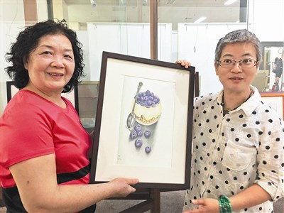 六十六歲的黃月霞(左)不識字也不曾拿過畫筆,王姿尹對她的作品最感驚喜。圖/吳淑玲