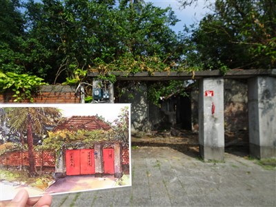 屏東市康定街一戶被保留的眷舍,近來紅色大門竟然不翼而飛,對比畫家曾經畫下的身影,實在讓眷村人心痛。圖/翁禎霞