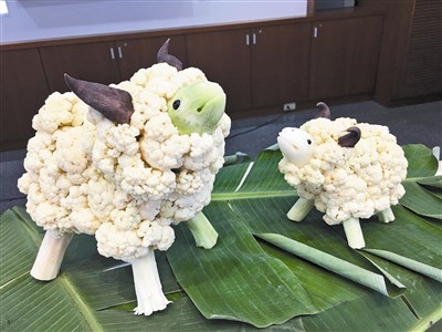 白色花椰菜做成的綿羊蔬果雕(圖),很有喜感。圖/吳淑玲