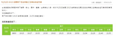 高鐵加開班次 19:15南港發車 |2016.11.25 語音朗讀 465觀看次 字級 大 中 小 高鐵今晚加開1班南下各站停靠的全車自由座列車。圖/台灣高鐵提供 【本報台北訊】台灣高鐵表示,為紓解周末南下苗栗、彰化、雲林、嘉義、台南等地人潮,今晚7時15分加開南下各站停靠的全車自由座列車。 高鐵將於今晚7時15分,自南港站加開1班各站停靠的全車自由座列車(商務車廂除外)。 加班車資訊如下: 南下8803車次 19:15 自南港站發車 21:55 抵達左營站 前一篇文章 找iPad失主…員警找到愛 下一篇文章 泰國29日 將開會討論皇儲即位 熱門新聞 01古坑桐花季 18日浪漫登場2026.04.100215%小琉球海龜曾受傷 癒合均需1年半2026.04.1003拚戰職籃26年 野獸林志傑引退 2026.04.1004襪子怎麼洗 翻面清潔效果佳2026.04.1005堅硬外殼農藥殘留少 鳳梨酪梨是乾淨蔬果2026.04.1006以轟黎巴嫩 伊朗關荷莫茲2026.04.1007陳念琴擊退北韓女將 亞錦賽奪金2026.04.1008巨型貓咪 進駐香港機場 2026.04.1009【同窗共遊】老友相聚溪頭深呼吸2026.04.1010【心情筆記】寬懷心花開2026.04.10 訂閱電子報 台北市 天氣預報 台灣一週天氣預報 相關報導 【星雲大師如是說】處事禪心【星雲大師如是說】人間佛教【星雲大師如是說】正信之美【星雲大師如是說】輪轉相繼【星雲大師如是說】有情的層次【星雲大師如是說】六忍歌